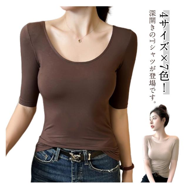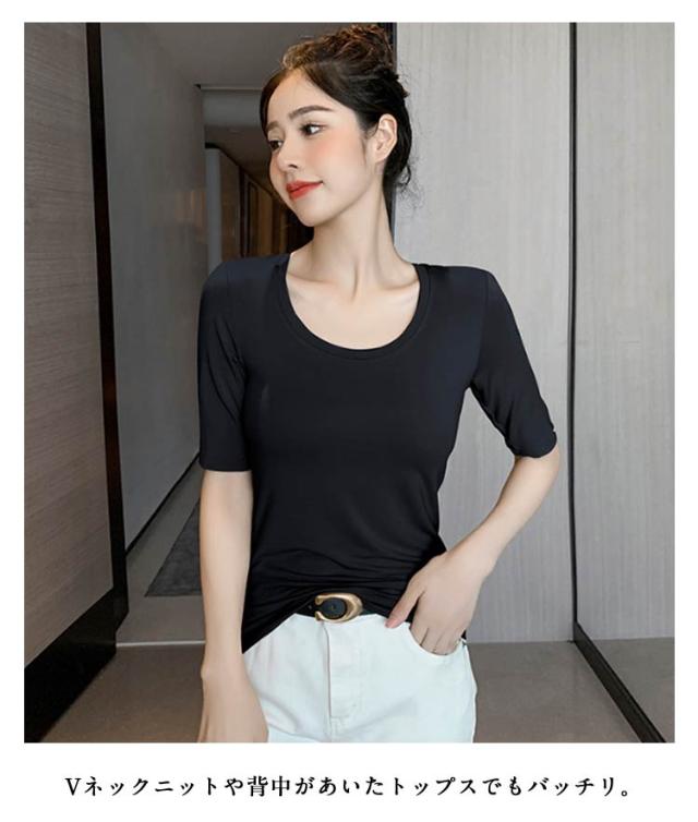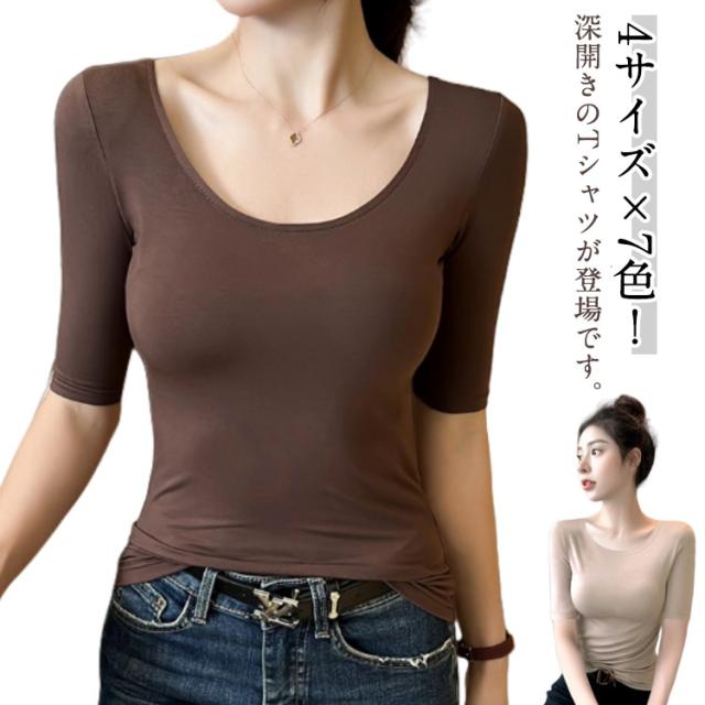 肩あき レディース 深あき 7分袖 オフショルダー肩開き インナー 服から見えない 通気 深開き ストレッチ 半袖 夏 tシャツ 肌着 ランドネック バレエネック 深あき 襟ぐり広め 春秋 無地 シンプル カジュアル 薄手 肌着