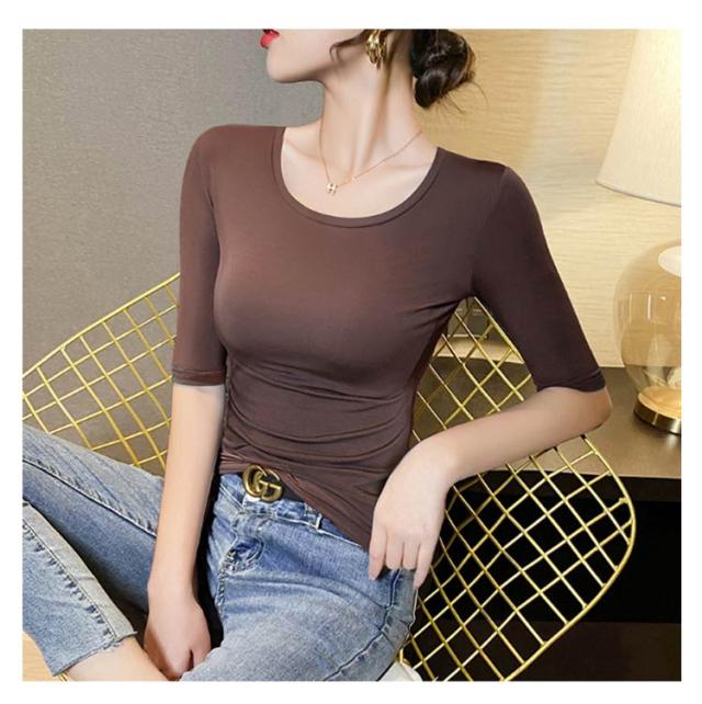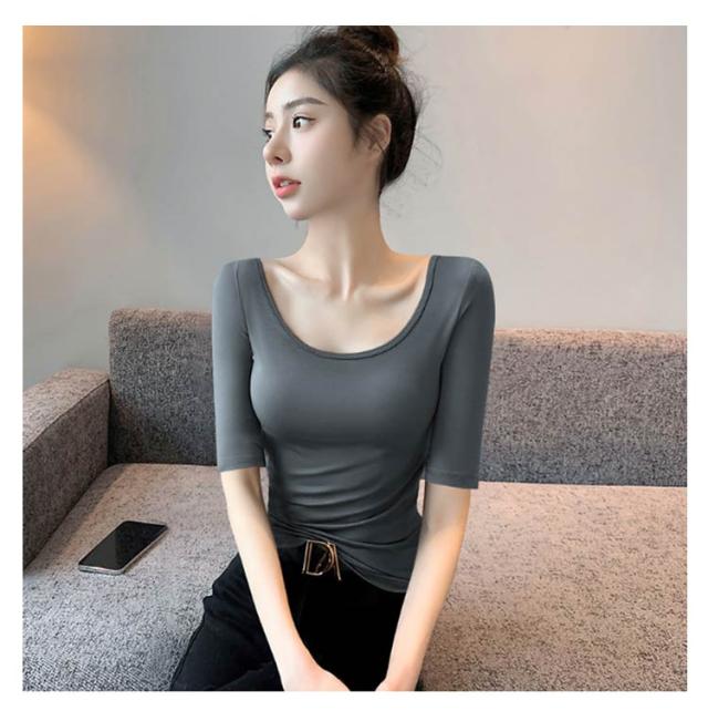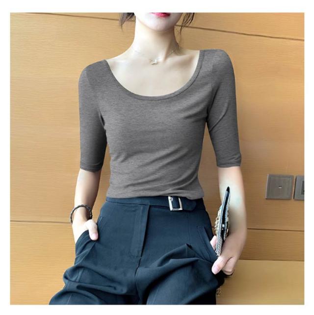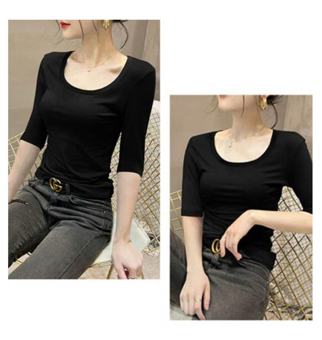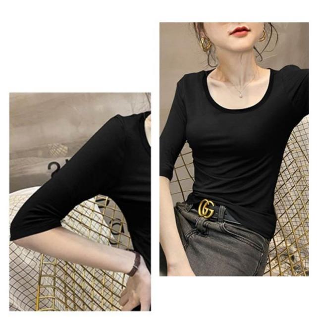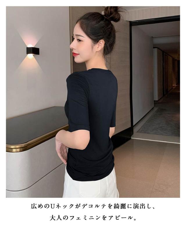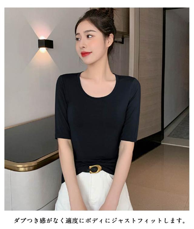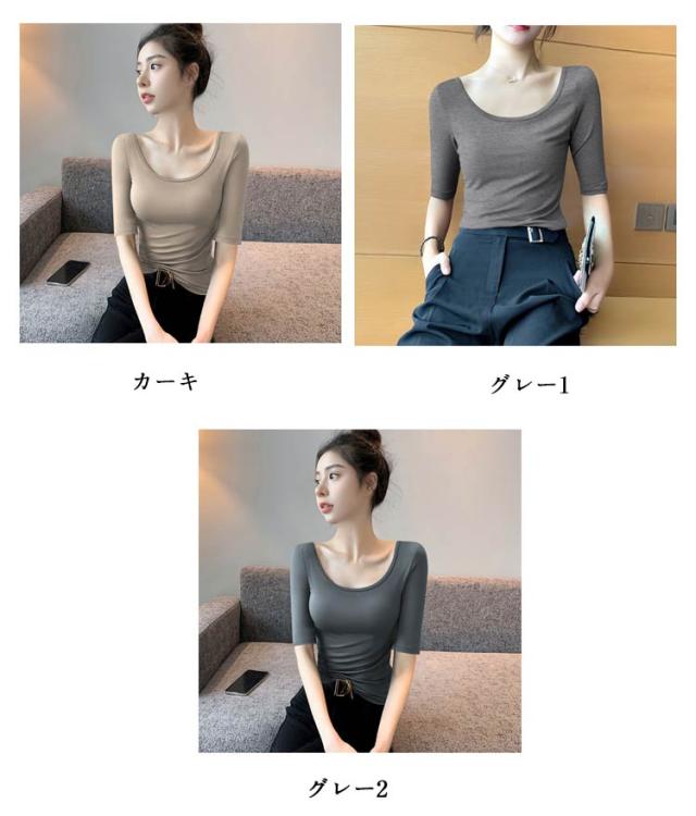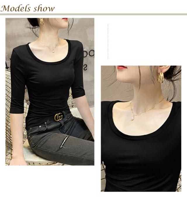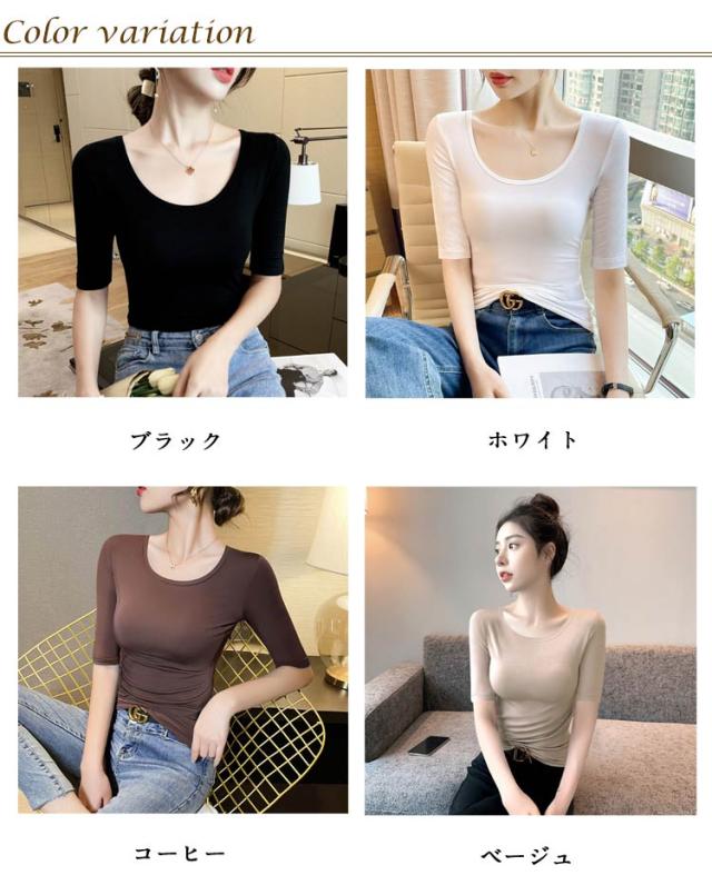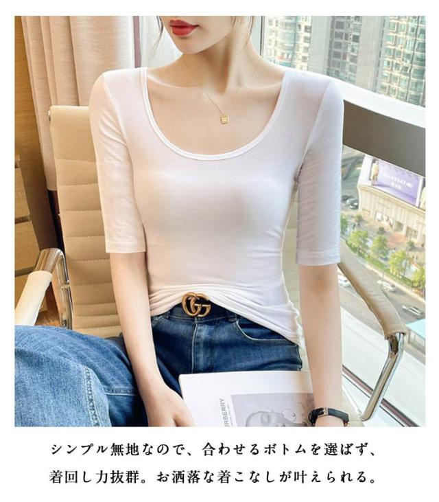 | 4サイズ×7色!深開きのTシャツが登場です。 ソフトでなめらかな肌触りで快適な着心地。 ロングシーズン使える5分袖丈が嬉しいポイント。 ダブつき感がなく適度にボディにジャストフィットします。 Vネックニットや背中があいたトップスでもバッチリ。 広めのUネックがデコルテを綺麗に演出し、大人のフェミニンをアピール。 シンプル無地なので、合わせるボトムを選ばず、着回し力抜群。お洒落な着こなしが叶えられる。 | |