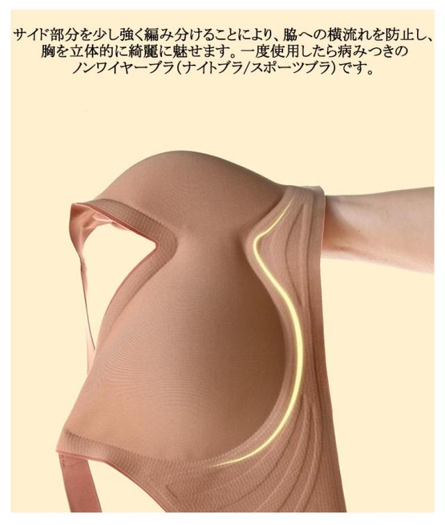 | ノンワイヤーの仕様でストレスフリーな着用感!3D補正と谷間メイク!ストラップが重力の力でバストを支えて、セクシーな谷間を中心に演出できます。 ナイトブラとしてはもちろん、育乳ブラ、ヨガブラ、スポーツブラとしてもおすすめです。 ダンス、運動、ジム、妊娠と哺乳期間睡眠時幅広くお使いいただけます。 肌触りの良い細やかなスムース編みでストレスの少ない付け心地。 伸びも良いのであらゆるバストを包み込みます。 サイド部分を少し強く編み分けることにより、脇への横流れを防止し、胸を立体的に綺麗に魅せます。一度使用したら病みつきのノンワイヤーブラ(ナイトブラ/スポーツブラ)です。 | |