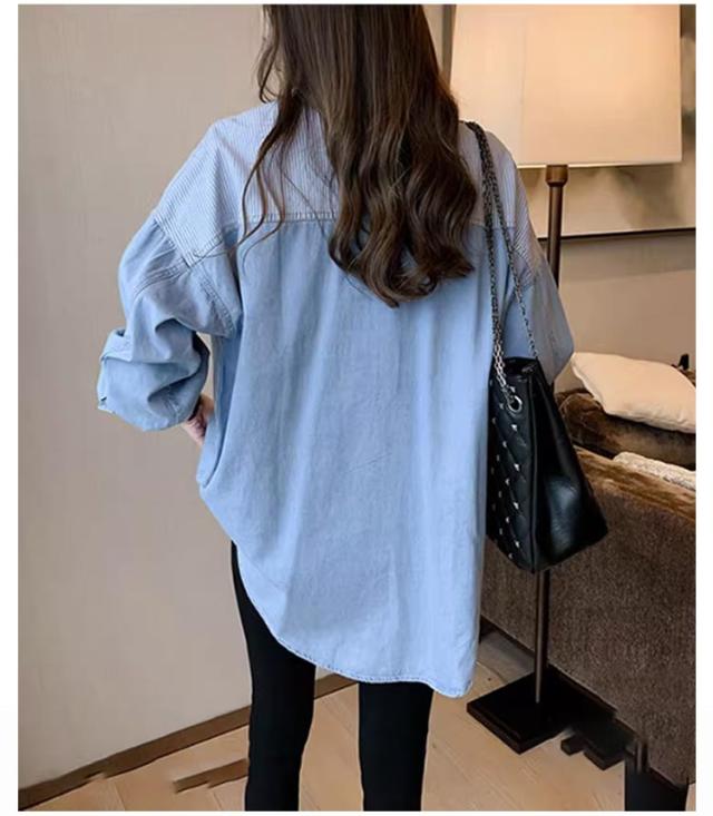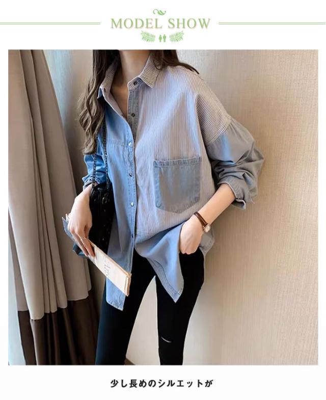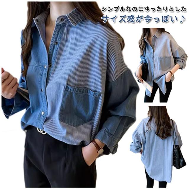 デニム シャツ トップス ウエスタンシャツ パッチワークシャツ ゆったり 大人 切替え 春 デニムシャツ ストライプ オーバーサイズ 大きいサイズ カジュアル ロング 春夏 デニムシャツ 長袖 夏 秋 秋色 韓国 着回し シンプル おしゃれ