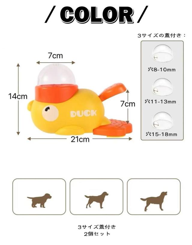 | 【知育給餌器】 【2個セット】 【3サイズの蓋付き】 【遊び心満載のデザイン】可愛いアヒル型の自動給餌器で、猫や犬が楽しく食事を楽しむ!知育おもちゃとしても、遊びながら自分で餌を取り出せる仕組みが、ペットの好奇心を引き立てます。 【健康的な食事習慣をサポート】スローフィーダーの特長で、早食いを防止!愛するペットの健康を守るための給餌機能が備わっており、暴飲暴食を防ぎます。 【お手入れ簡単な素材】安心のABS素材を使用しており、洗えるので清潔に保てます。ペットの食事環境を常に清潔に保つことができ、衛生的なペットライフを実現! 【多用途の給餌機】日常の家庭喫食、トレーニング、そして外出時の使用に最適!この給餌器は、ペットが楽しんで学びながら、おいしいエサを食べることができる優れものです。 知育効果で犬のストレス解消&猫の狩猟本能刺激に有効。留守番時の退屈しのぎに最適で、通常の食事時間より30%長く楽しめる設計。 さまざまなペットに適しています: あらゆるサイズのペット向けに設計されており、小型、中型、大型のペット 3サイズの蓋付き: 穴8-10mm 穴11-13mm 穴15-18mm | |
