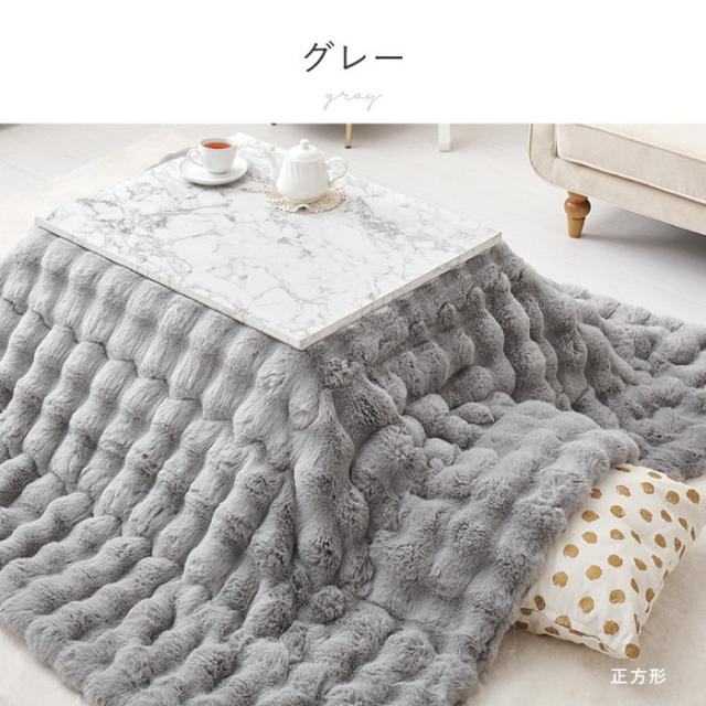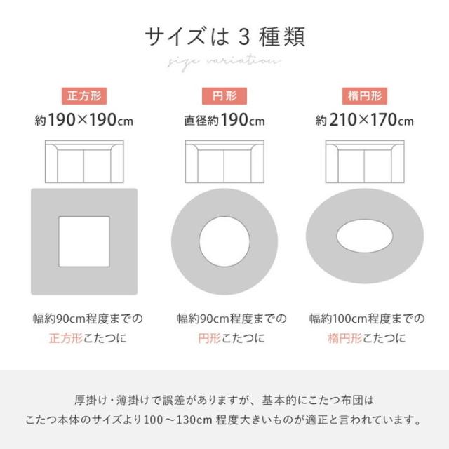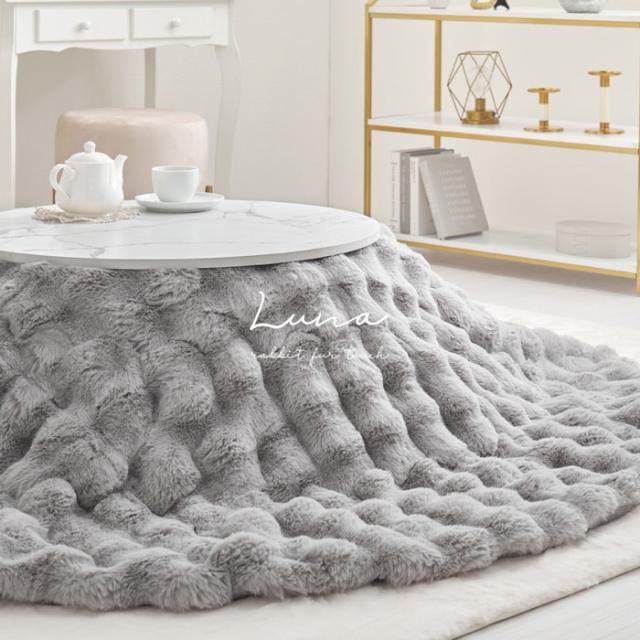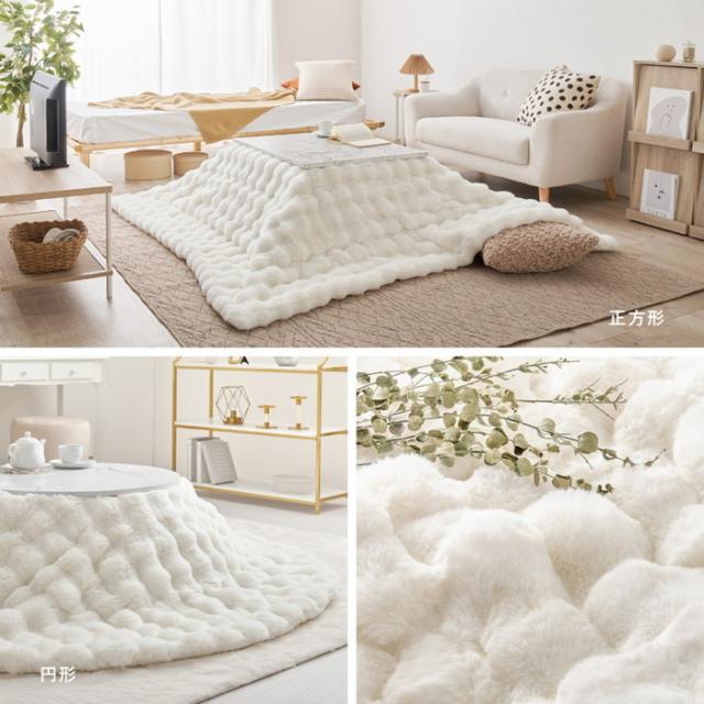 うさぎの毛並みを表現した「ラビットファー調」は、きめ細やかでうっとりするような、なめらかな肌ざわり。やさしく包み込むようなふわふわタッチに、ぽこぽことした見た目も可愛いおしゃれなこたつ布団です。かさばらずすっきりと使いやすい薄掛けタイプのこたつ布団ですが、たっぷりの中わた入りでボリュームがあり、ぎゅっと詰まった高密度な長毛パイルが空気を多く含み、あたたかさを保ち快適に。また、洗濯機で洗えるから汚れても安心、いつも清潔にお使いいただけます。【サイズ】約210×170cm 楕円形【カラー】グレー、アイボリー【素材】表生地:ポリエステル100%中材:ポリエステル100%裏生地:ポリエステル100%【生産国】中国■洗濯機OK※モニターにより、色の見え方が実際の商品と異なることがございます。※画像はイメージです。商品・サイズにより柄の入り方など、現物と多少異なる場合がございます。