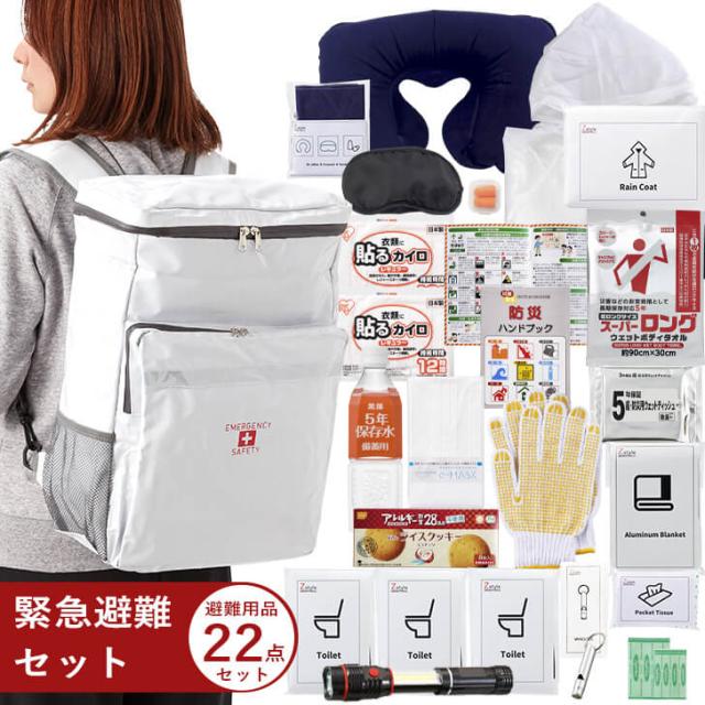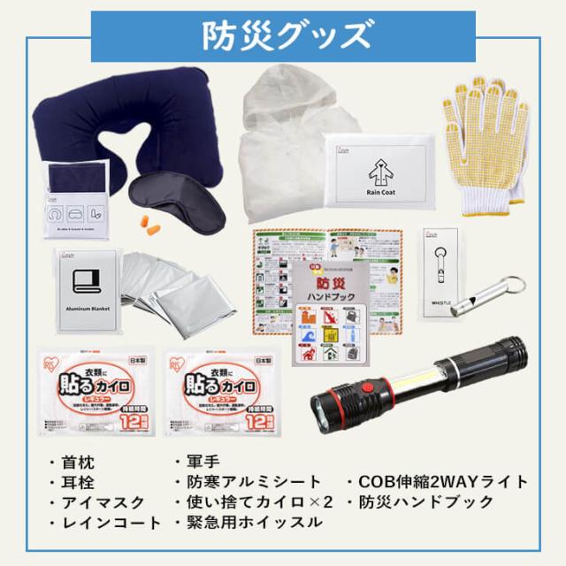 避難用ターポリンリュックバッグ、COB伸縮2WAYライト、緊急用ホイッスル、非常用トイレ1P×3 、防寒アルミシート、ウェットティッシュ、軍手、使い捨てカイロ×2、防寒レインコート、絆創膏(大小×各2)、ウェットボディタオル、ポケットティッシュ、不織布マスク、首枕、耳栓、アイマスク、防災ハンドブック、備蓄用飲料水、ライスクッキー(※アレルギー物質28品目不使用)