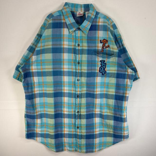 古着 ディズニー Disney 半袖シャツ キャラクター ティガー クマのプーさん チェック 大きいサイズ XL ブルー系 マルチカラー メンズ