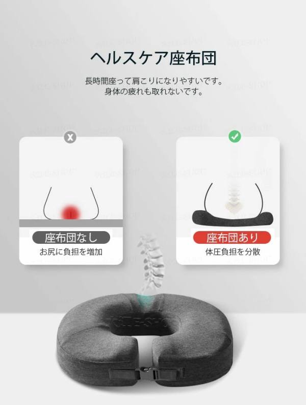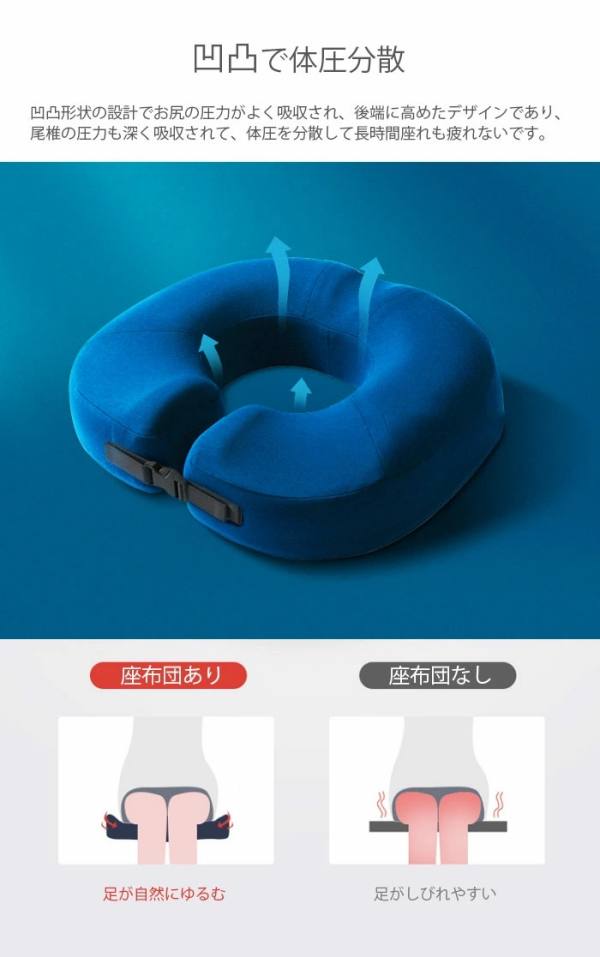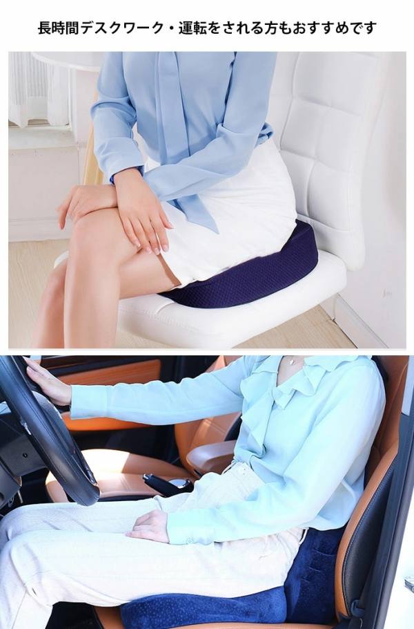 お尻や太ももへの圧力を吸収/分散され、長時間座っても疲れにくく、お尻の痛みを気にせず快適な座り心地の健康クッションです。
