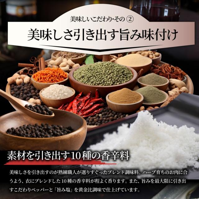 骨付鶏肉(国産)、食塩、香辛料(大豆を含む)、衣(小麦粉、でんぷん、糖類(砂糖、ぶどう糖)、食塩、香辛料、コーンフラワー、粉末状植物性たんぱく、粉末油脂、植物油脂)、揚げ油(なたね油、パーム油)/加工デンプン、調味料(アミノ酸)、重曹、膨脹剤、乳化剤、着色料(カロチノイド)、増粘剤(キサンタン)、香辛料抽出物