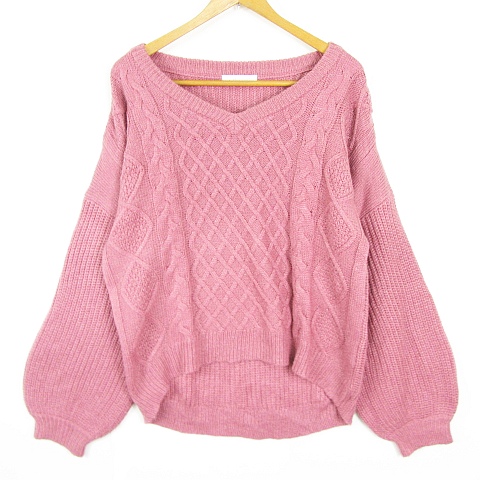 【中古】ローリーズファーム LOWRYS FARM ニット セーター 長袖 Vネック ケーブル編み 毛 L ピンク