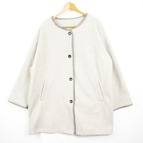 【中古】リノルーセ Linoluce ノーカラー ジャケット コート 毛 レーヨン 綿 L グレージュ ステッチ