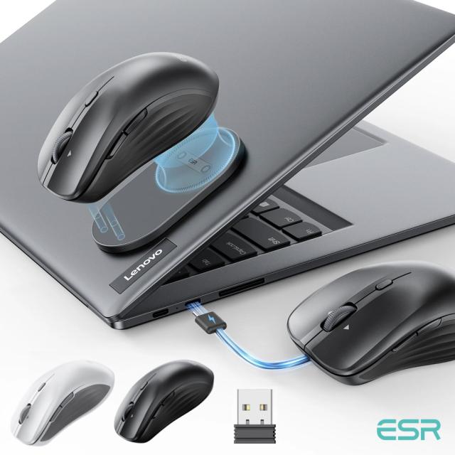 ESR MagMouse ワイヤレスマウス 電池不要 レシーバー付属 ノートパソコン用充電式ワイヤレスマウス 内蔵充電ケーブル 再利用可能な粘着ホルダー BT 5.0 + 2.4 GHz 接続 静音 人間工学設計
