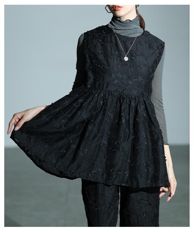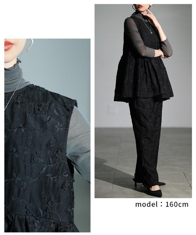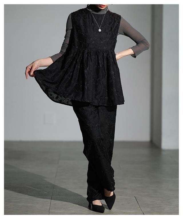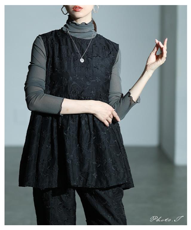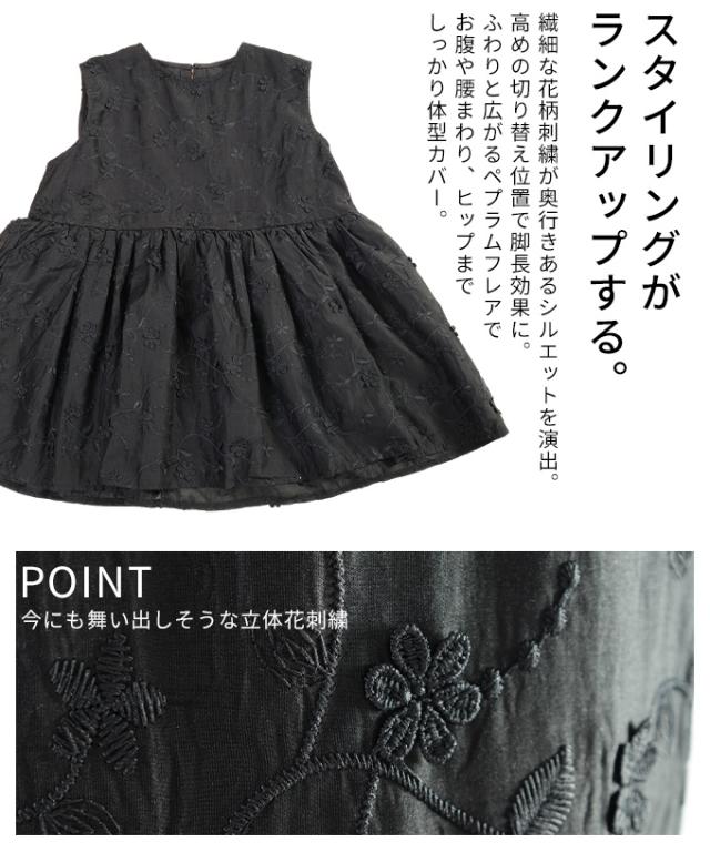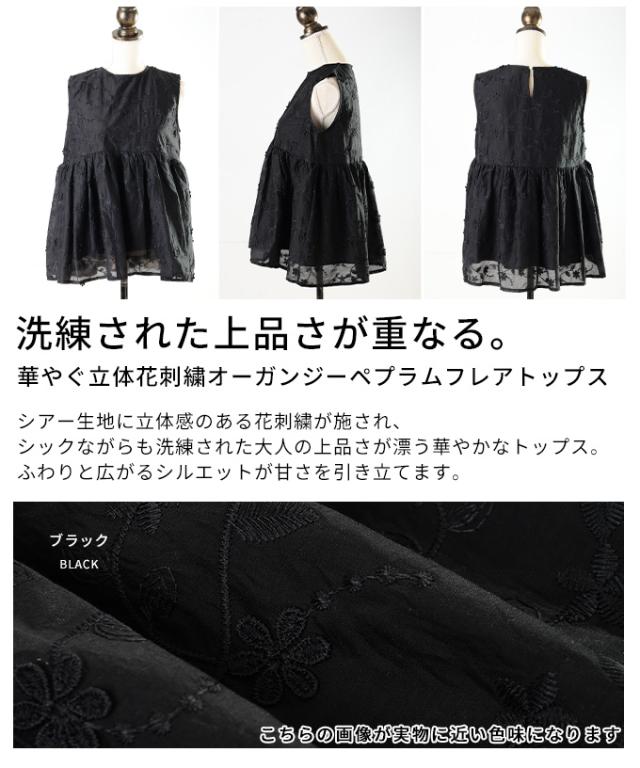 春新作 華やぐ上品さ重なる立体花刺繍オーガンジーペプラムフレアトップス レディース ファッション トップス 花柄 刺繍 ペプラム フレア ノースリーブ 黒 30代 40代 50代 60代 サワアラモード sawaalamode otona 大人 cawaii 可愛い 洋服 かわいい服 almam-1776