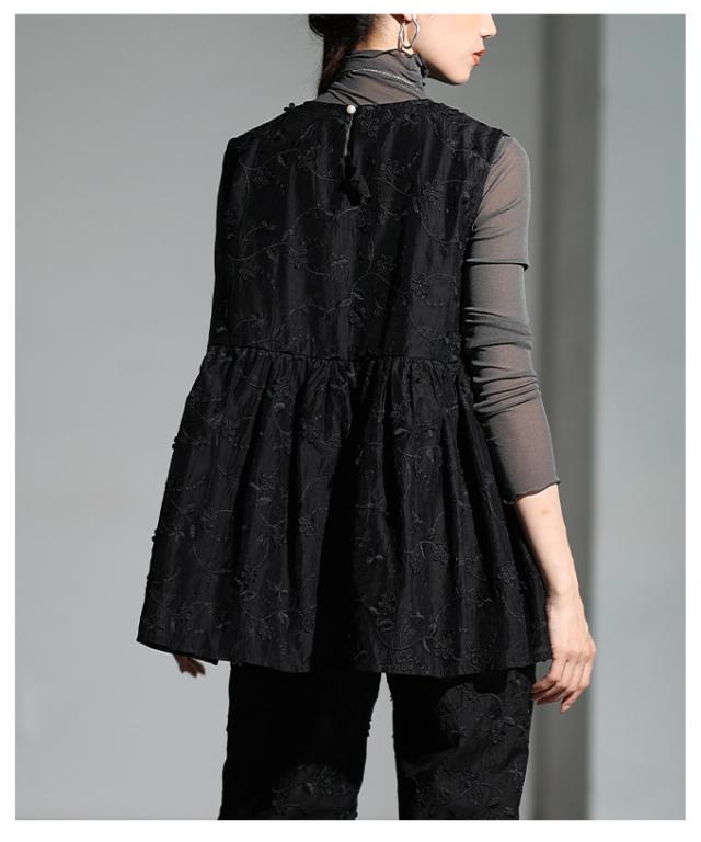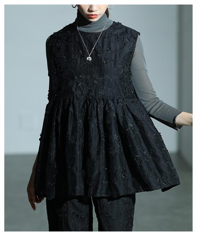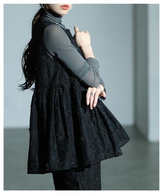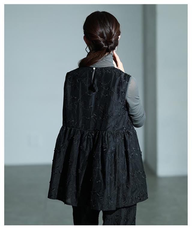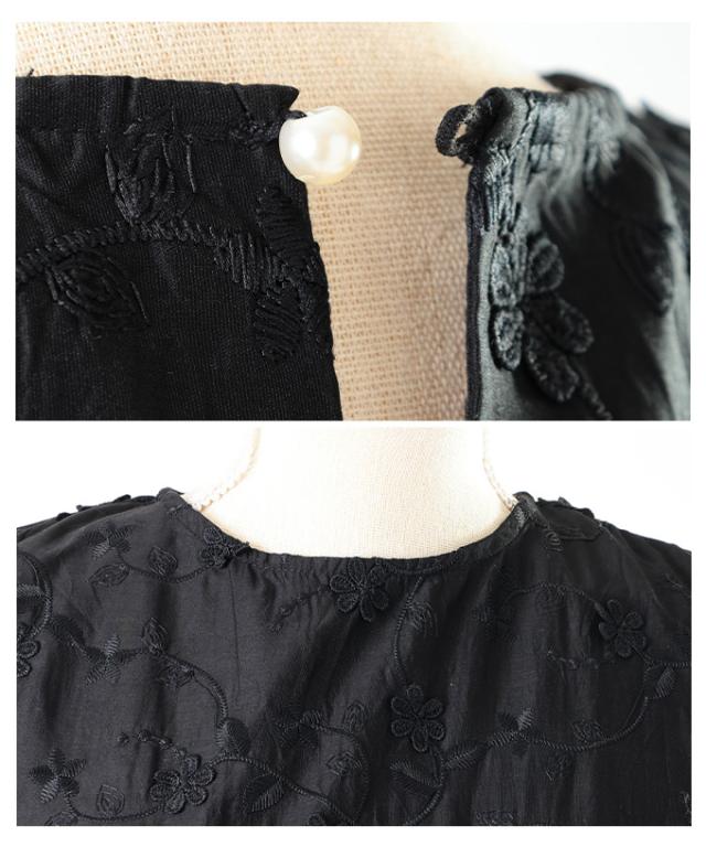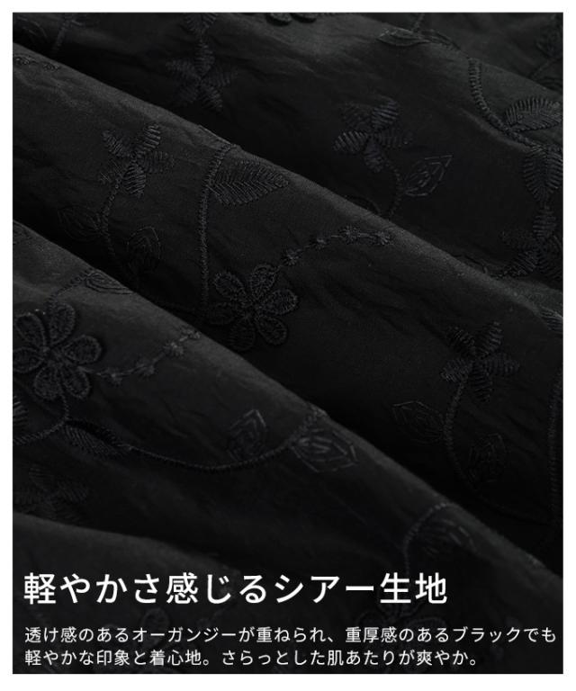 特徴: 花柄 刺繍 立体 ペプラム フレア バックボタン ギャザー シアー レイヤード