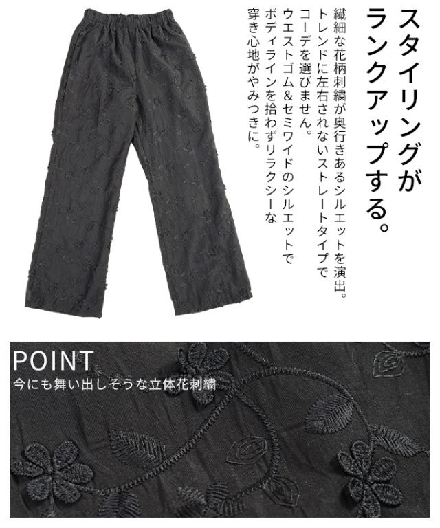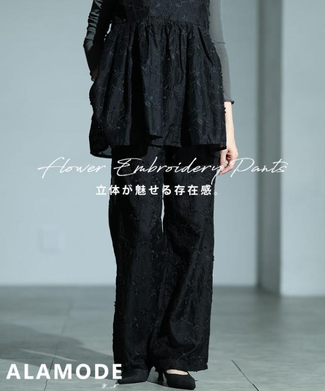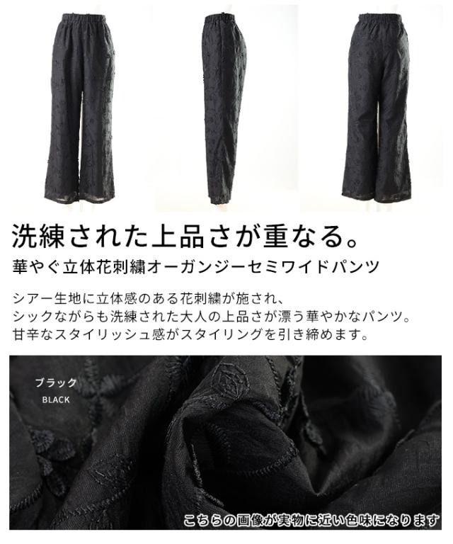 春新作 華やぐ上品さ重なる立体花刺繍オーガンジーセミワイドパンツ レディース ファッション パンツ 花柄 刺繍 ワイド ロング オーガンジー ウエストゴム 夏 30代 40代 50代 60代 サワアラモード sawaalamode otona 大人 cawaii 可愛い 洋服 かわいい服 almam-897