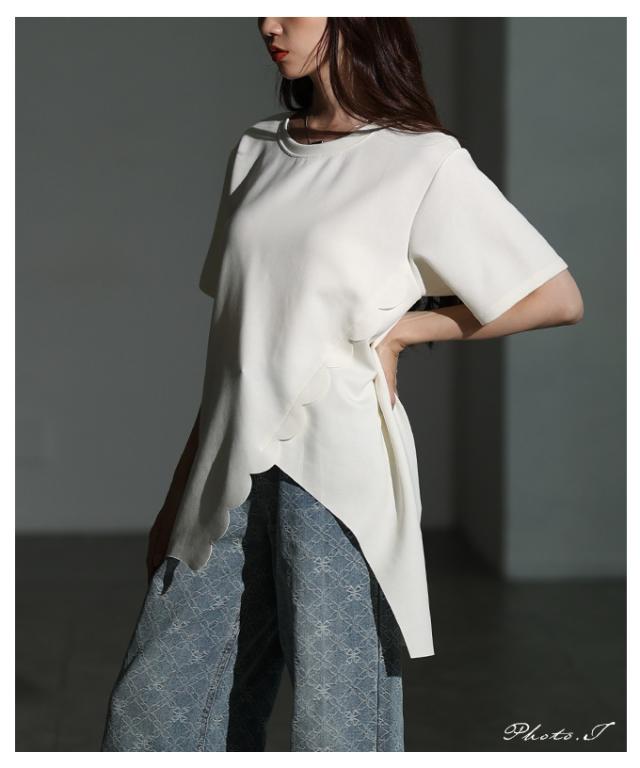 特徴: スカラップ アシンメトリー ダンボール生地 クルーネック