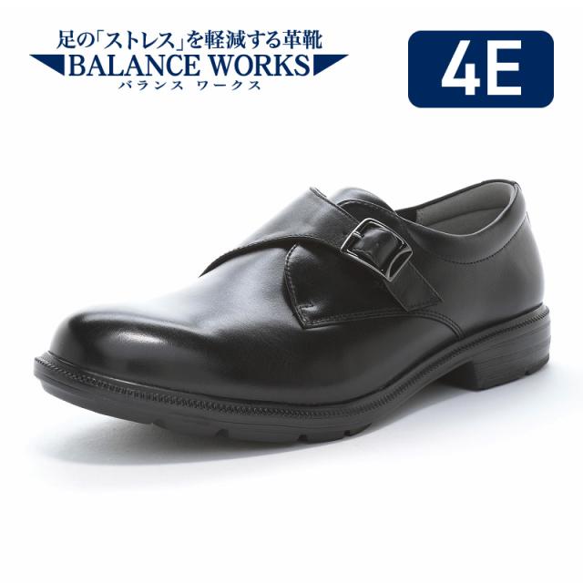 足のストレスを軽減するビジネスシューズ「バランスワークス」シリーズの4E(幅広)タイプです。「柔らかさ」と「安定性」を両立させた快適な着用感に加え、従来品から「軽量性」と「衝撃吸収性」をさらにアップさせたモデルです。バランス能力に関係する感覚の一つである足裏感覚を刺激する設計のインソールと、中央部のくぼみで安定性に優れる設計のアウトソールを搭載しました。ムーンスター独自開発の機能で足と靴のグラつきを抑え、着用ストレスの軽減に貢献します。日常の通勤や外回り、就活等で足元から快適を求めるあなたにおすすめです。デザインはモンクストラップ、重量は片足約265g/25.5cmです。【ワイド設計】幅広の方に対応した商品です。【耐摩耗ラバー】靴底の踵部と踏み付け部に耐摩耗ラバーを使用しています。