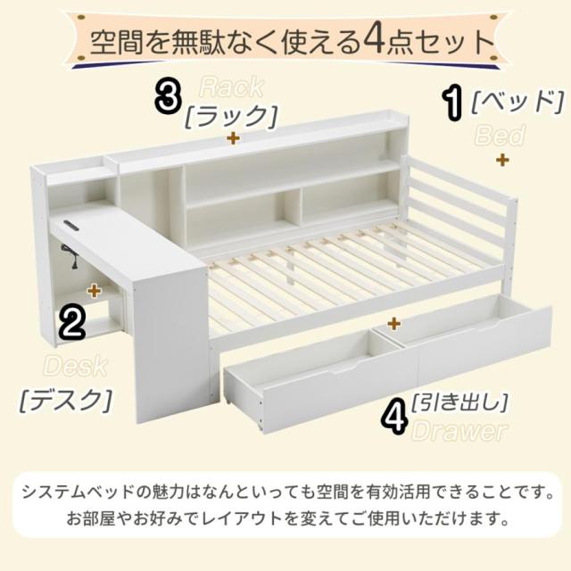 【勉強便利】これ一台で、デスクはベッドに近いので、勉強にも休憩にも便利ですし、省スペース【ベッド、デスク、ラックをコンパクトにまとめたシステムベッド】1 シンプルデザイン 2 質のよい材料 3大容量の収納スペース 頑丈設計 5 宮付き 小物収納 6 通気性良い