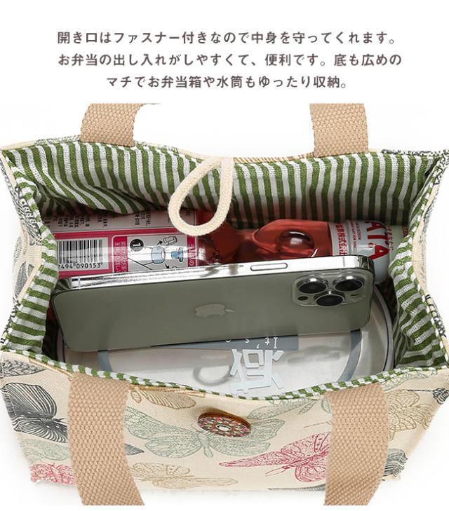 開き口はファスナー付きなので中身を守ってくれます。お弁当の出し入れがしやすくて、便利です。底も広めのマチでお弁当箱や水筒もゆったり収納。