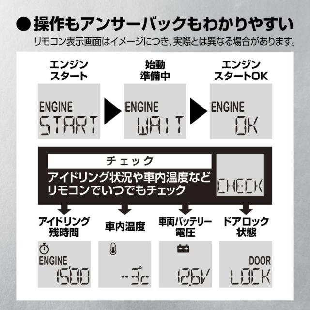 ・ 車両特性によりエンジンの始動判断が行えません。リモコンの画面に表示される内容はエンジンスターターの作動状態を示し、実際の車両の状態とは必ずしも連動していません。詳しくは製品の取扱説明書で「エンジンをかける」項目を参照してください。また、エンジンスターターでエンジンが始動できなかった場合でも、アイドリング設定時間の間、車両の電源がONになることがあります。