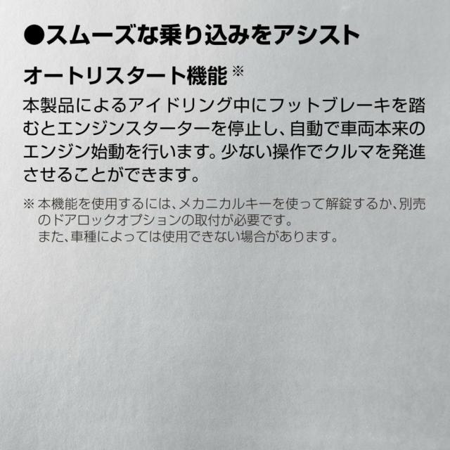 ・ エンジンスターターによるアイドリング中に純正の携帯リモコンを持って車両へ乗り込んだ後にフットブレーキを踏むと、エンジンの停止と再始動を自動で行います(オートリスタート機能)。再始動後は車両本来のエンジン始動状態になります。