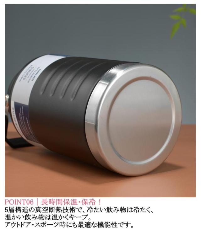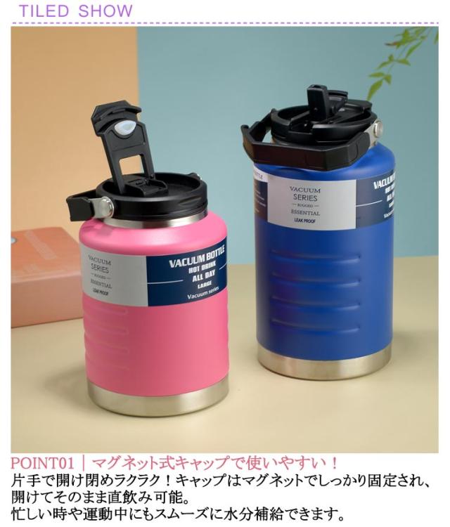 | 真空断熱 大容量魔法瓶 1500ml / 2000ml|スポーツ・アウトドア・ジムに最適な水筒 POINT01|マグネット式キャップで使いやすい! 片手で開け閉めラクラク!キャップはマグネットでしっかり固定され、開けてそのまま直飲み可能。 忙しい時や運動中にもスムーズに水分補給できます。 POINT02|二重密封で漏れない安心構造 高性能シーリングで転倒しても漏れにくい設計。 アウトドアや車内でも安心して使える魔法瓶です。 POINT03|握りやすいカバーハンドル 持ち運びしやすいカバー付きハンドルを採用。 手が痛くなりにくく、持ち歩きにも最適! POINT04|食品級ステンレス採用 内側は304ステンレス製で抗菌性・耐錆性に優れ、毎日清潔に使用可能。 お子様から大人まで安心して使える素材です。 POINT05|広口&大容量で使いやすい 氷も入れやすい広口設計で洗いやすく、お手入れ簡単! 1.5L/2Lの大容量で一日中しっかり水分補給。 POINT06|長時間保温・保冷! 5層構造の真空断熱技術で、冷たい飲み物は冷たく、温かい飲み物は温かくキープ。 アウトドア・スポーツ時にも最適な機能性です。 多用途で大活躍! キャンプ・ジム・ランニング・登山・ピクニック・スポーツ観戦・お仕事・車内常備など、 さまざまなシーンで便利にお使いいただけます。 | |