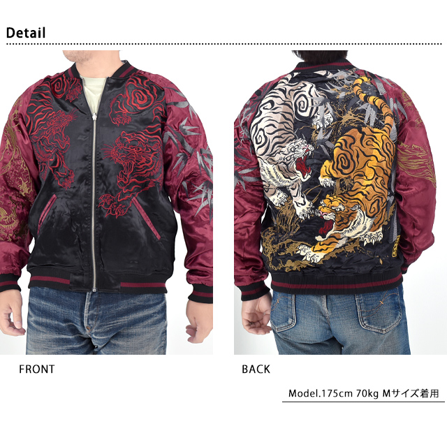絡繰魂さんから「粋 猛虎ノ戯れリバーシブルスカジャン(253077)」のご紹介です。 重みを感じる程の刺繍量が魅力的な粋シリーズから、最新作のスカジャンが登場しました。 モチーフの主役に採用されたのは、根強い人気を誇る猛虎。 背中には二頭の虎の姿をダイナミックに刺繍しました。 周囲には笹竹を組み合わせ、奥行きのある仕上がりに。 絵柄は身頃から袖へと続いているため、実際に着用した際にはより立体感をお楽しみいただけます。 表面はしっかり柄の入ったスカジャンですが、対象的に裏面はシンプルに仕上げ、メリハリを付けました。 ボディーにはレーヨンサテンを使用し、ドレープや陰影がくっきりと現れています。 1枚持っているだけでずっと使えるスカジャン。 | ||||||||||||||||||||