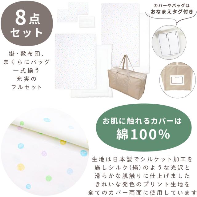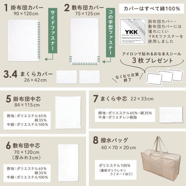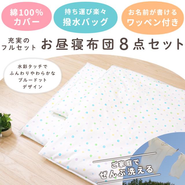 お昼寝布団セット ブルードット 充実の8点セット 綿100% 洗える敷き布団 防水バッグ 名前ワッペン ネームタグ お昼寝ふとん ファスナーカバー 保育園 コンパクト 子供 キッズ un doudou OHF