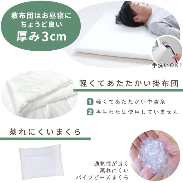 ※お昼寝布団は、保育園・幼稚園のお昼寝用として持ち運びに便利なよう簡易的に作られています。 赤ちゃんの長時間の睡眠には適しておりません。
