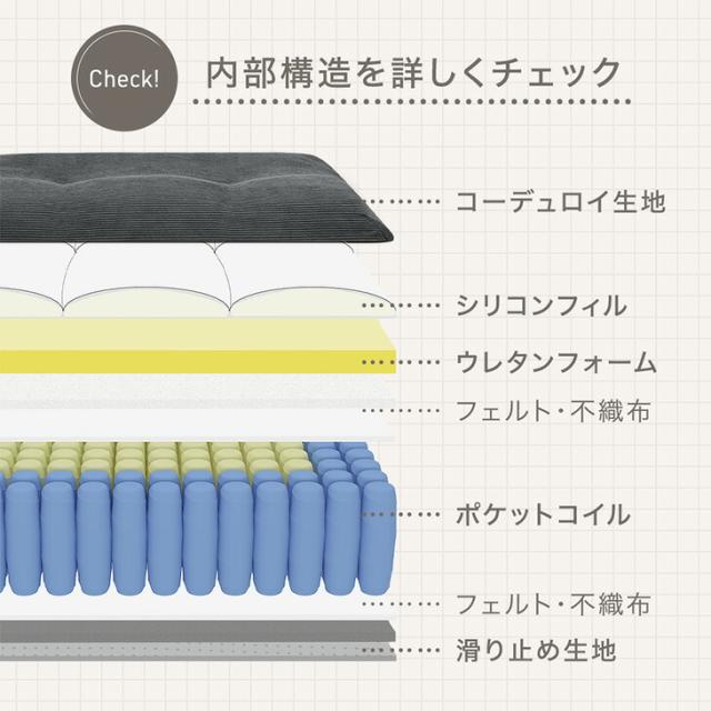 中材:ウレタンフォーム、シリコンフィル綿、ポケットコイル