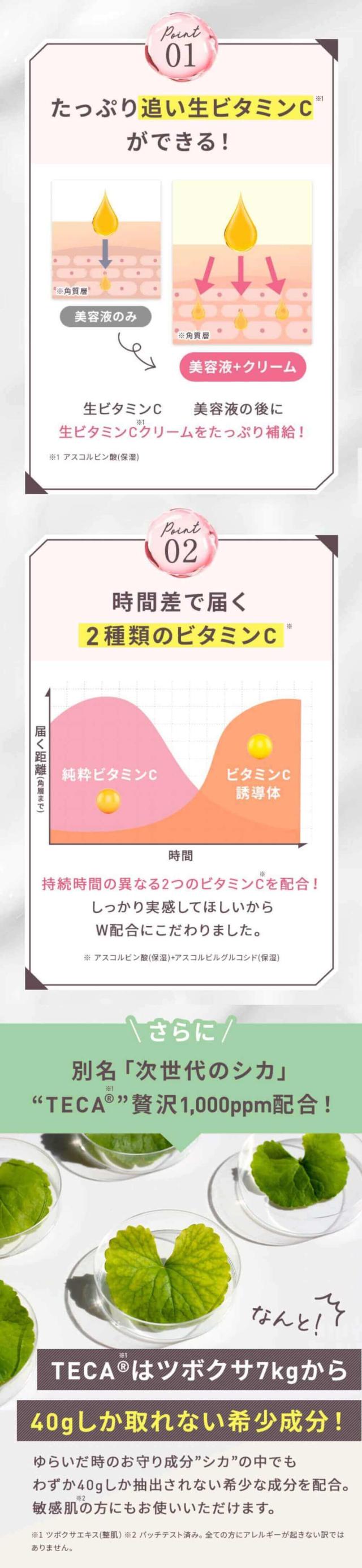| こんな方におすすめ | 生ビタミンC美白美容液をお使いの方、お肌が乾燥しやすく敏感ぎみな方、ベタつくクリームに苦手意識がある方、クリームの油分でお肌が荒れて欲しくない方 |