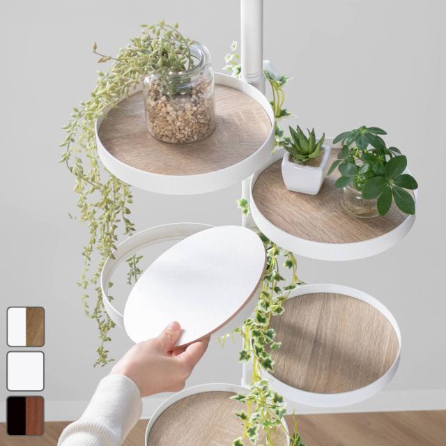 突っ張りポールラック 丸型トレイ5個 高さ調整 見せる収納 ( 突っ張りラック 突っ張り棒 ラック ハンガー ポール スリム 収納 突っ張り 隙間 つっぱり棚 スリムラック 収納ラック トレー 5段 観葉植物 リバーシブル 両面 )