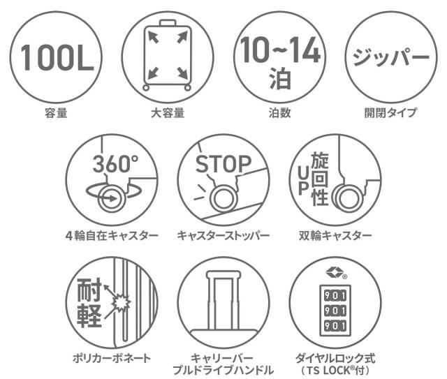 ACE/エース/ace/Fretboard/フレットボード/スーツケース/キャリーケース/キャリーバッグ/キャリー/100L/100リットル/L/Lサイズ/大型/10泊/11泊/12泊/13泊/14泊/1週間/1週間用/1週間サイズ/10〜14泊/長期/旅行/海外/海外旅行/長期旅行/国外旅行/ファスナータイプ/ファスナー/ジッパー/ストッパー付き/ストッパー/キャスターストッパー/キャスターストッパー付き/TSロック/TSAロック/TS/TSA/4輪/四輪/双輪/両面仕切り/仕切り/横開き/ポリカーボネート/ハードケース/旅行/トラベル/出張/ビジネス/シンプル/カジュアル/上品/ビジネスカジュアル/ビジカジ/おしゃれ/オシャレ/お洒落/ブランド/男性/女性/メンズ/レディース