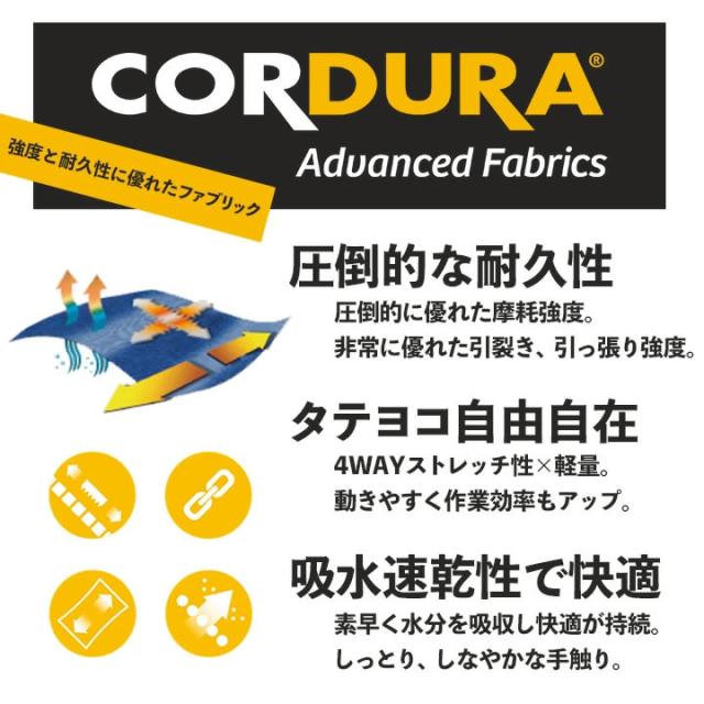 | 製品 仕様 | ■ 素材:コーデュラ4WAYストレッチリップ(伸長率30%)、吸汗速乾加工 混率:ナイロン(CORDURA)88%・ポリウレタン12% |