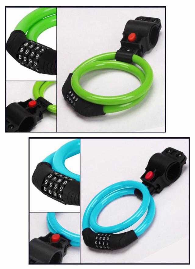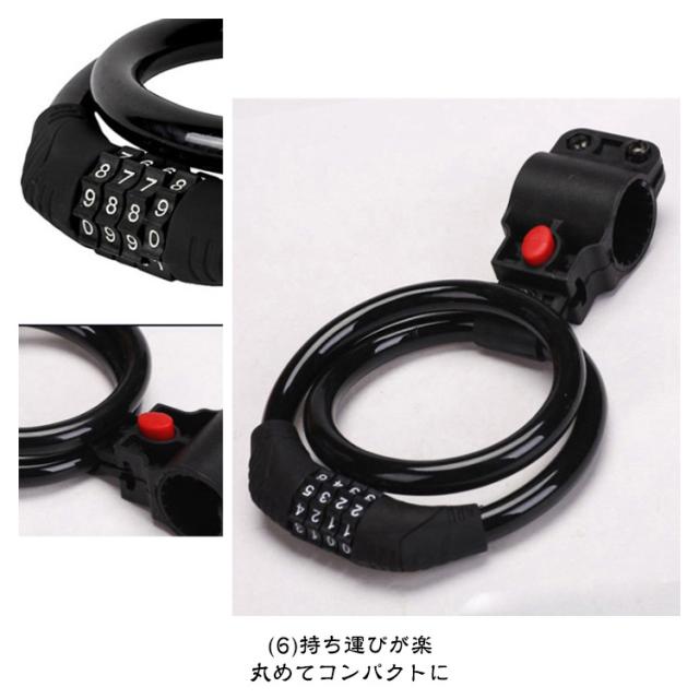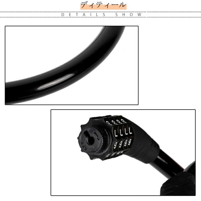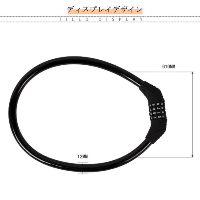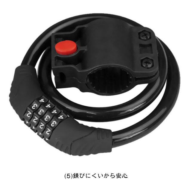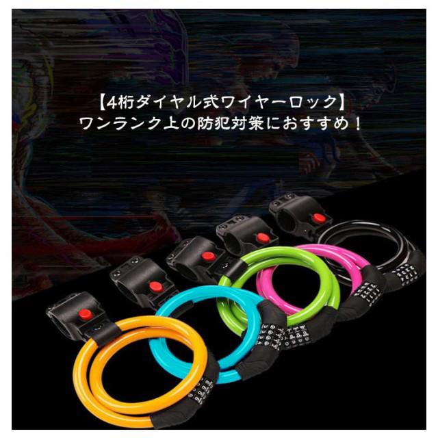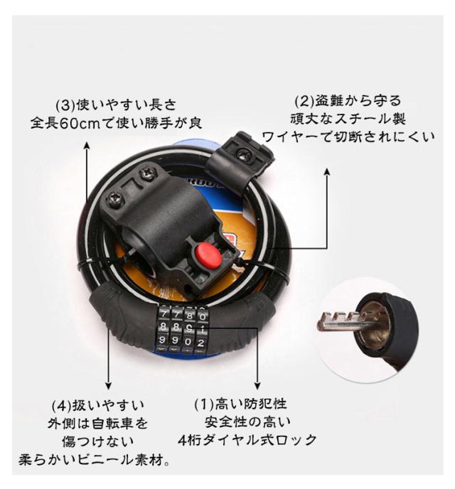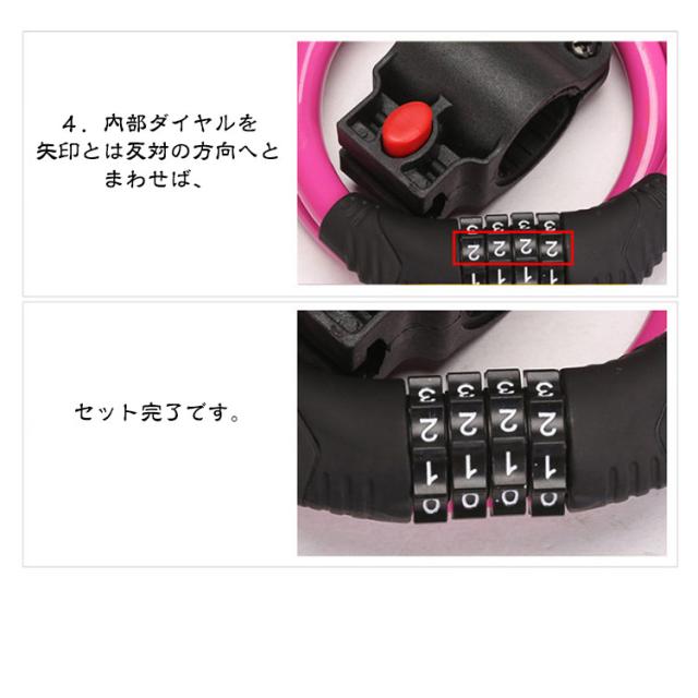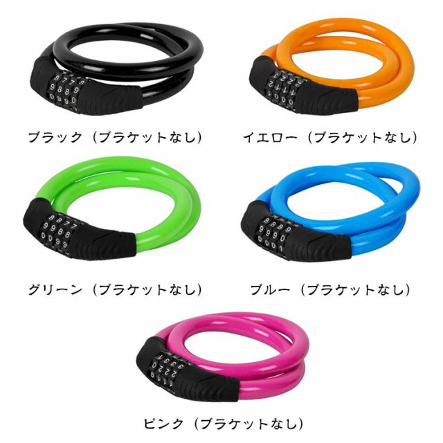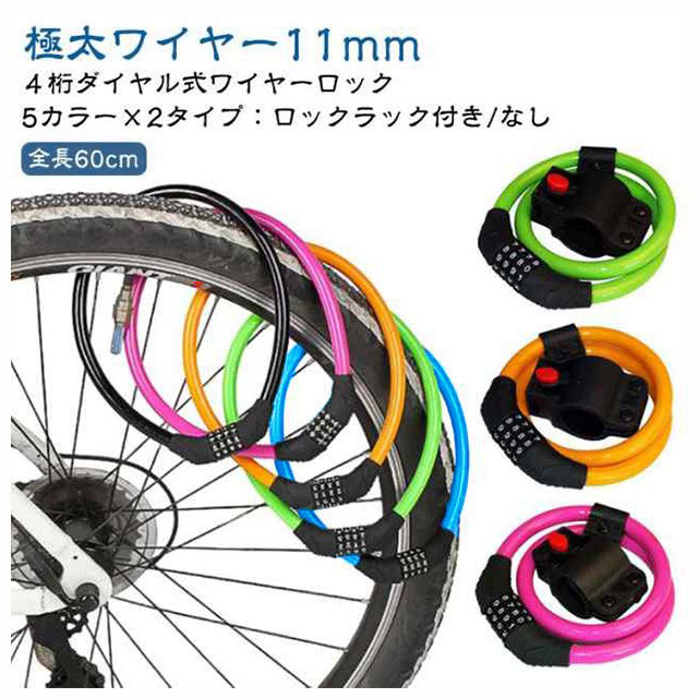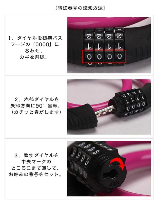 | 全長60cm 極太ワイヤー11mm 4桁ダイヤル式ワイヤーロック 5カラー×2タイプ:ロックラック付き/なし 4桁ダイヤル式ワイヤーロック】 ワンランク上の防犯対策におすすめ! <おすすめポイント> (1)高い防犯性 安全性の高い4桁ダイヤル式ロック (2)盗難から守る 頑丈なスチール製ワイヤーで切断されにくい (3)使いやすい長さ 全長60cmで使い勝手が良い (4)扱いやすい 外側は自転車を傷つけない柔らかいビニール素材。 (5)錆びにくいから安心 (6)持ち運びが楽 丸めてコンパクトに (7)専用ブラケット付き ・サドル等への取付けが可能になる専用ブラケットを付属。 装着したまま走行可能なので、どこかになくすこともありません。 (8)選べる5色。 ・愛車のワンポイントにも。 見た目も爽やかブルーから、個性豊かなピンクまで。 愛車に合わせて、気分に合わせて、お好きな色をお選び下さい。 〔暗証番号の設定方法〕 1.ダイヤルを初期パスワードの「0000」に合わせ、 カギを解除。 2.内部ダイヤルを矢印方向に90°回転。 (カチッと音がします) 3.数字ダイヤルを中央マークのところにまで回して、 お好みの番号をセット。 4.内部ダイヤルを矢印とは反対の方向へとまわせば、 セット完了です。 | |
