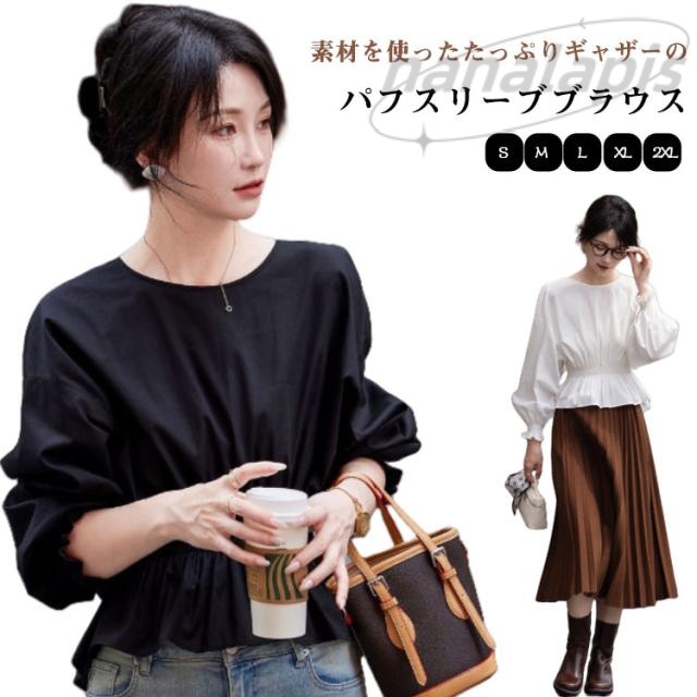 パフスリーブブラウス ボリュームパフスリーブブラウス ボリュームパフスリーブブラウス 袖口ゴム レディース フレアトップス パフスリーブ シャツ オフィス バルーンブラウス ブラウス トップス バルーン クルーネック 着回し きれいめ シャツ