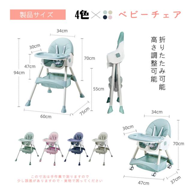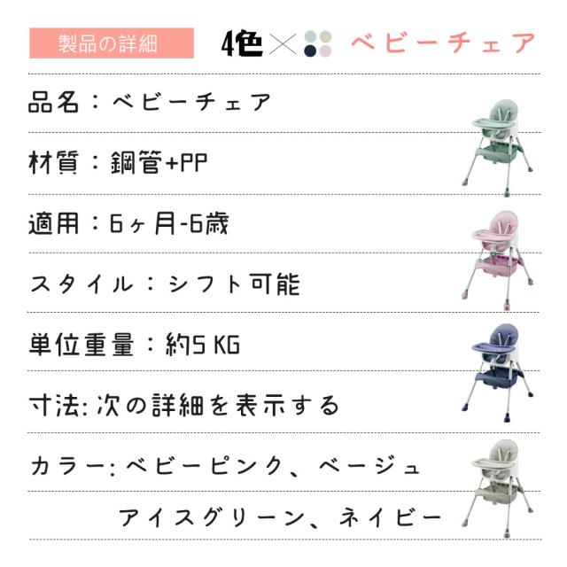 商品名ベビーチェア素材/材質 ベース・テーブル:鋼管+PP内いす:EVAストラップ:ポリエステルサイズ約W75×D60×H94cmカラーベビーピンク、アイスグリーン、ベージュ、ネイビーおススメ理由 機能の特徴 1.折りたためて収納しやすい。 2.工具不要でハイチェア 、ローチェアの2wayで使える。2タイプ・多機能ハイローチェア:足の調節でハイチェアにもローチェアにも変身できる一台二役の機能的ダイニングチェア。また、ハイチェアとローチェアの両モードにそれぞれキャスターを取り付けることができ、移動便利です!5カ月頃から4歳頃まで長くお使いいただけます。 3.キャスターの取り外しが可能。 4.3点ハーネスで赤ちゃんをしっかり支えます。シートは軽量デザインを採用し、後ろに掴む部分があるので、持ち運びの際便利です。 適用可能な人々 1.生後5か月から〜4歳2.離乳食を始めたばかりの月齢の低いお子さま3.お子様連れのお母さんたち ご注意事項