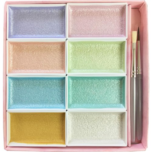 顔料に、天然高級デンプン質と膠分を加え、練り混ぜ角皿に入れて乾燥させた ものです。日本画材料の中では特に普及しています。色調は透明型淡彩色で、俳画、南画、日本画調繊細画などのほか、ハガキなどの挿し絵、岩絵具の 下塗り、写生用などに使用します。(1ケ約5cc) 【セット内容】 パール紫 パール橙 パール青 パール金 パール赤 パール黄緑 パール緑 パール銀