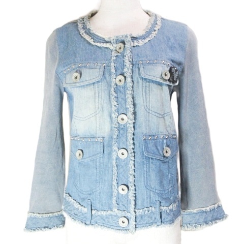 【中古】メイソングレイ ノーカラー デニム×ニット ジャケット スタッズ フリンジ ブローチ付き 1 S相当 青 ブルー X