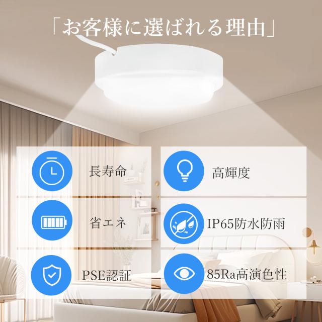 防水IP65仕様のシーリングライトは、浴室、脱衣所、バルコニー、ポーチなど、水まわりや屋外でも安心して使用できます。LED搭載で明るさを確保しつつ、省エネ設計で電気代を節約できます。防塵・防虫設計により、ホコリや小さな虫の侵入を防ぎ、清潔かつ快適にご使用いただけます。長寿命で耐久性に優れ、日常生活からアウトドアまで幅広く活躍します。本製品は配線工事が必要ですので、必ず専門の電気工事士による施工を推奨します。機能性と安全性を兼ね備えた、防水型シーリングライトです。