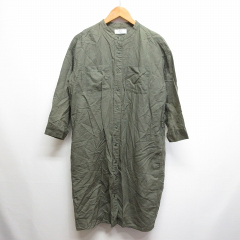 【中古】ユニクロ UNIQLO リネン コットン ワンピース シャツ 七分袖 M カーキ レディース