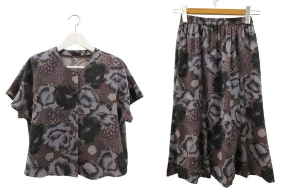 【中古】詩仙堂 セットアップ ジャケット ブラウス 半袖 スカート ウエストゴム 花柄 紫 パープル系 縮緬 ちりめん