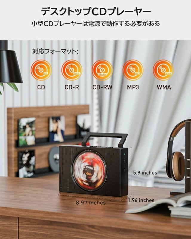 本製品はCD,CD-R,CD-RW,MP3,WMA,WAVなどのフォーマットに対応した幅広く使えるコンパクト音楽CDプレーヤーです。(ご注意:ブルーレイディスクが再生できません、ご了承ください)。6mの範囲内で楽々簡単に操作できます。