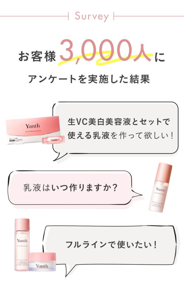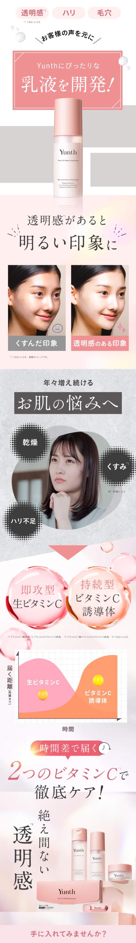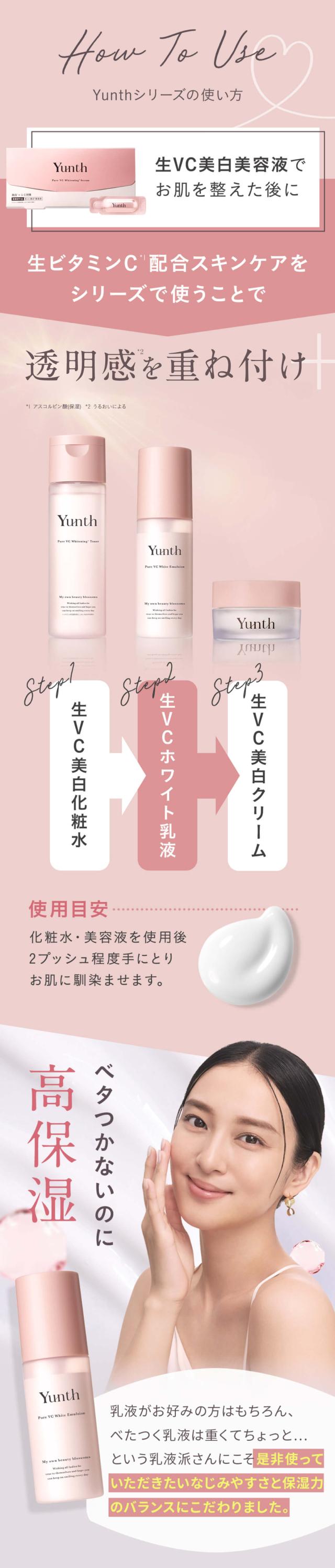 | 商品特徴 | お肌に吸い付くように馴染み みずみずしい透明感*1と潤い与える保湿乳液 化粧水の後にはこの1本。肌本来の保湿成分に類似した「ヒト型セラミド*2」と「生ビタミンC*3」が時差で働き、ハリと弾力に満ちたツヤ肌へ導く乳液です。Yunthスキンケアシリーズの併用で、より効果的なスキンケア体験をお楽しみください。 *1 うるおいによる *2 セラミドAP、セラミドNG、セラミドNP、セラミドEOP(整肌) *3 アスコルビン酸(整肌) |