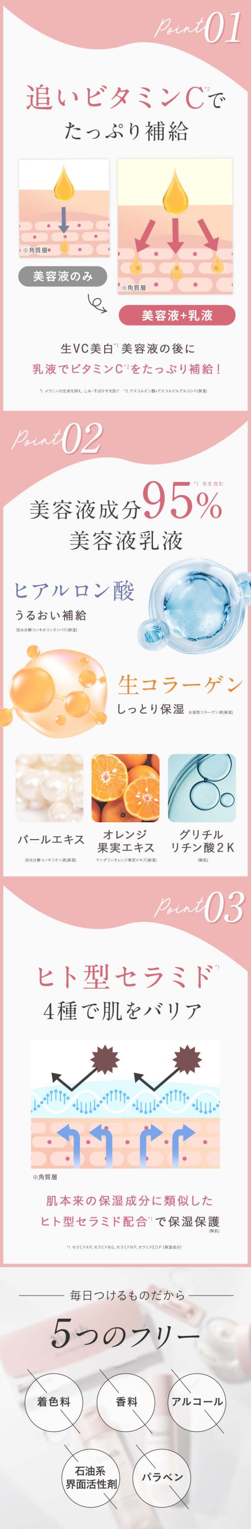 | こんな方におすすめ | 生VC美白美容液をお使いの方 乾燥肌、インナードライ肌、敏感肌の方 お肌の水分量が気になる方 日頃の保湿ケアだけでは物足りない方 |