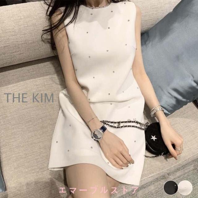 韓国デザインのビジューデザインノースリーブワンピースドレス。