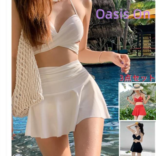 レディース 体型カバー ビキニ 水着 3点セット フリル バンドゥビキニ セパレートワイヤー入り 韓国 ハイウエスト 大人 ミセス