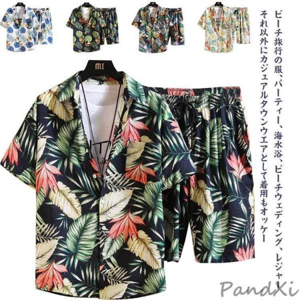 アロハシャツ メンズ 半袖 シャツ 上下セット カジュアル 2点セット ビーチ 温泉浴 夏 旅行 ハワイ 花柄 ハーフパンツ 短パン 海水浴