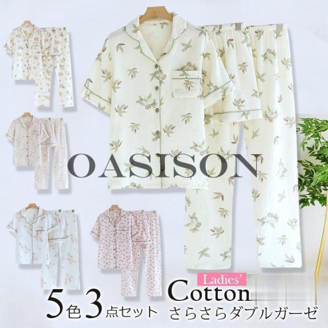 ガーゼパジャマ レディース 綿 ダブルガーゼ 二重ガーゼ パジャマルームウエア 半袖 花柄 部屋着セットアップ3点セット半袖半ズボン長ズボン