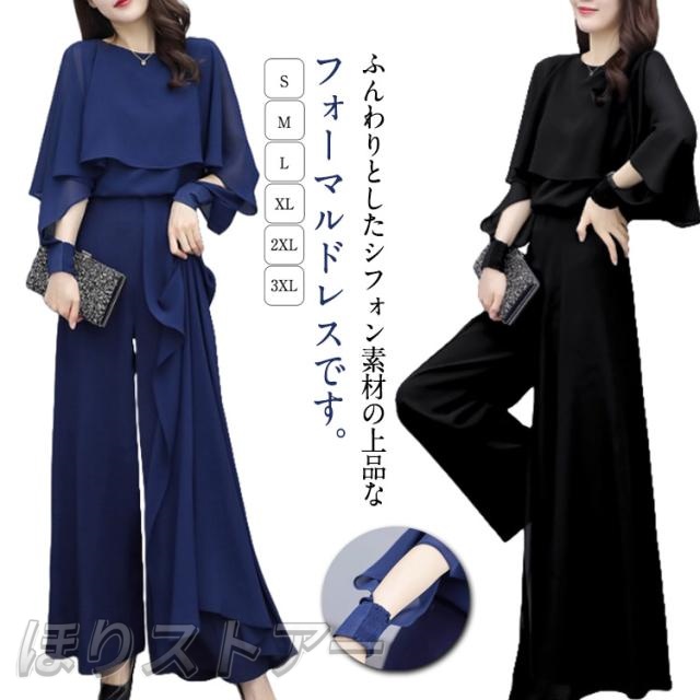 | ふんわりとしたシフォン素材の上品なフォーマルドレスです。 ゆったりとしたラッフルスリーブのトップスは気になる二の腕をカバーします。 マキシ丈のワイドレッグパンツは脚長効果があります。 | |