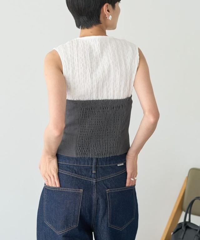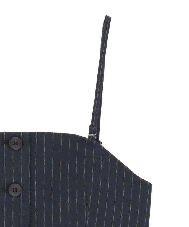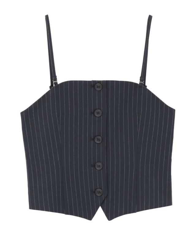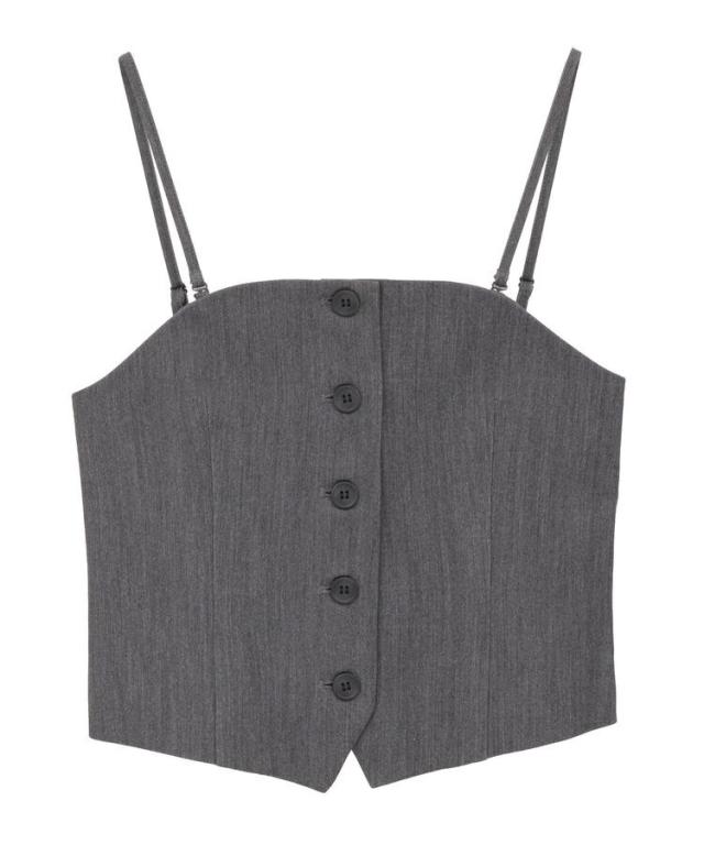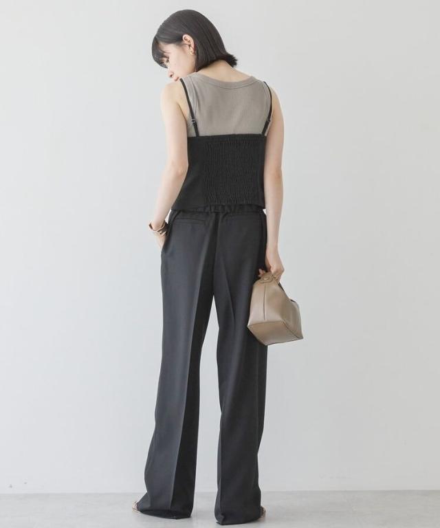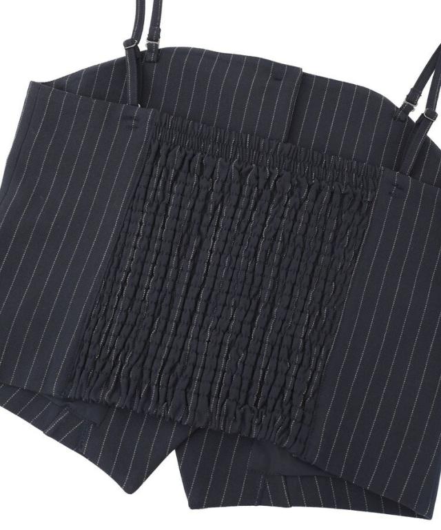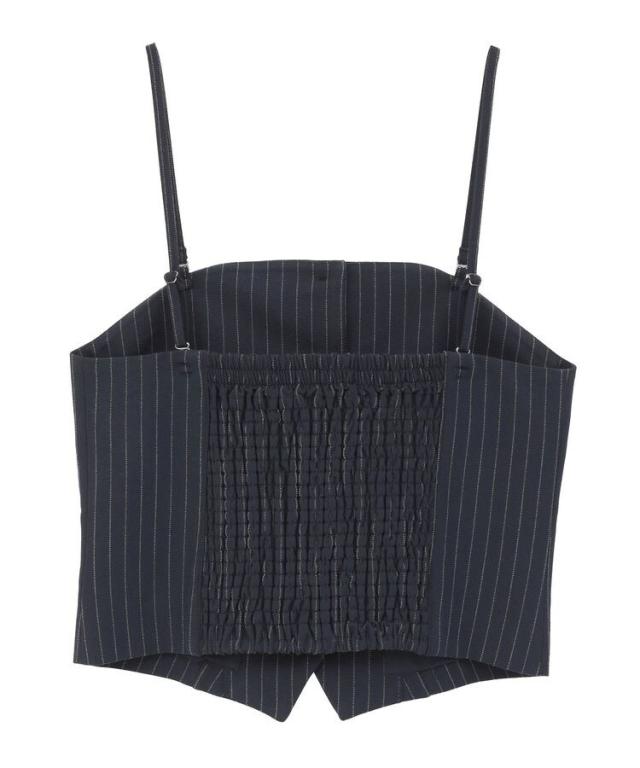 マニッシュな雰囲気で着こなしのアクセントになるビスチェ。アジャスター付きの肩紐は取り外し出来、キャミソールとしてもビスチェとしてもお使いいただけます。背中にゴムギャザー入りで伸縮性に優れ、程よく身体にフィット。シワになりにくいイージーケア素材でお手入れしやすいのも嬉しいポイントです。シンプルなトップスに重ねるだけで季節感のある着こなしが完成するおすすめのアイテムです。透け感[なし]