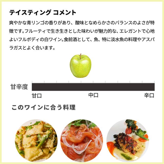 ![]() ■ぶどう品種:シャルドネ ■標高:420-470m メロールのエリアで育つシャルドネは、豊かな味わいとシルクのようなエレガントさを持ち、酸味とやわらかさのバランスに優れ、フルーティな余韻が続くワインを生み出します。一部(約25%)は木樽で、残りはステンレスタンクで発酵・熟成させます。 爽やかな青リンゴの香りがあり、酸味となめらかさのバランスのよさがこのシャルドネワインの特徴です。フルーティで生き生きとした味わいが魅力的な、エレガントで心地よいフルボディの白ワインです。 |