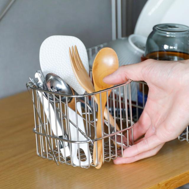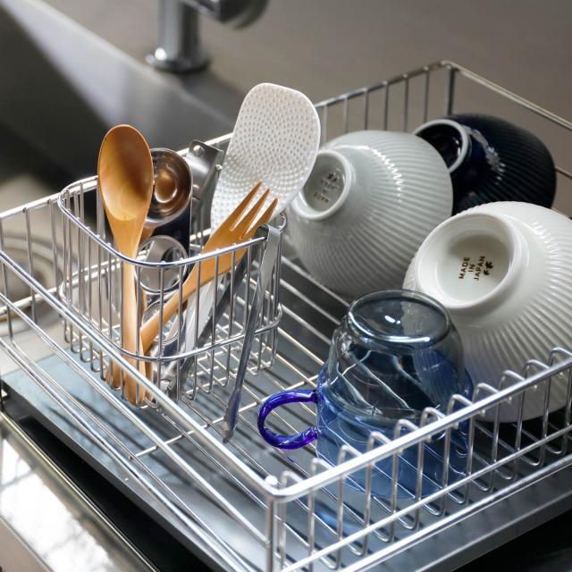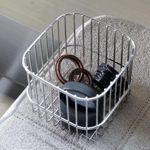 水筒のフタやパッキンなど、水切りかごの中で迷子になりがちな小物をまとめて乾かすことができます。ワイヤー間隔が約0.9cmなので隙間から落ちてしまう心配もありません。